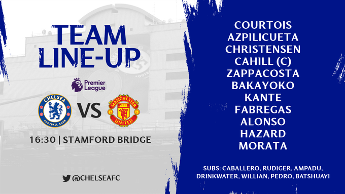 Chelsea starting: Courtois; Azpilicueta, Christensen, Cahill (c); Zappacosta, Bakayoko, Kante, Fabregas, Alonso; Hazard, Morata.