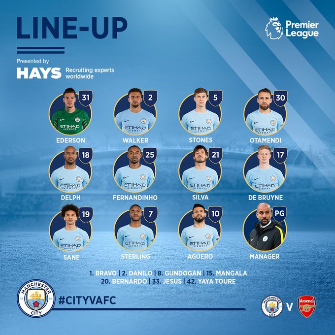 Manchester City starting: Ederson, Walker, Otamendi, Stones, Delph, Fernandinho, De Bruyne, Silva (c), Sterling, Sane, Aguero