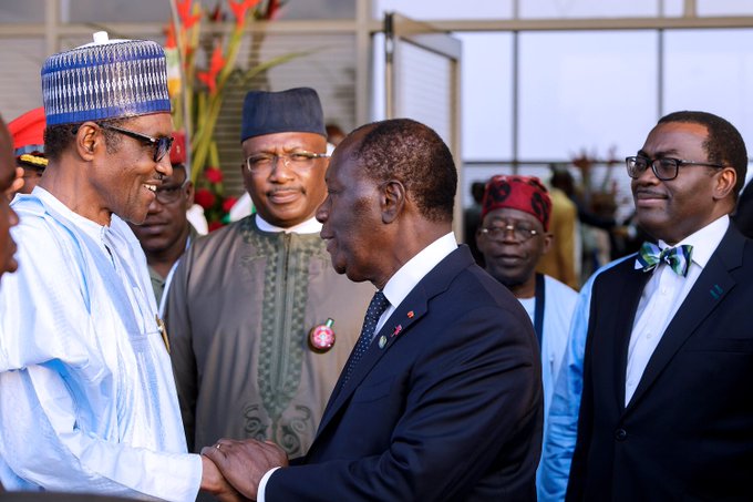Yesterday, President Muhammadu Buhari @MBuhari was received by President Alassane Ouattara of Cote D'Ivoire, on arrival in Abidjan, Cote D Ivoire.