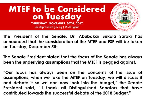 Yesterday, President of the @NGRSenate, Dr. Abubakar Bukola Saraki announced that the consideration of the MTEF and FSP will be taken on Tuesday, December 5th.