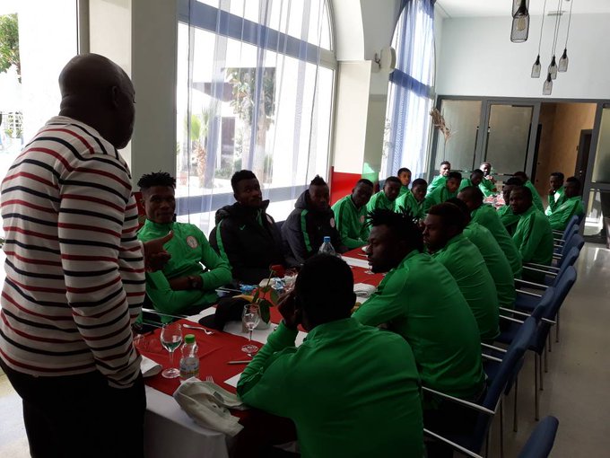 The president of Nigeria Football Federation, NFF Amaju Pinnick was pictured with the home based Super Eagles ahead of tonight clash against Rwanda.
