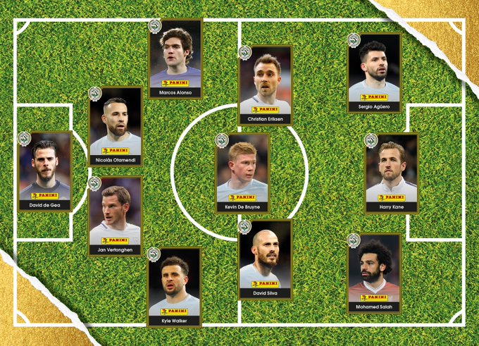 🙌 PFA Premier League TOTY!@OfficialPanini GK | David De Gea RB | Kyle Walker CB | Jan Vertonghen CB | Nicolás Otamendi LB | Marcos Alonso MID | David Silva MID | Kevin De Bruyne MID | Christian Eriksen FWD | Harry Kane FWD | Mohamed Salah FWD | Sergio Agüero 🏆#PFAawards