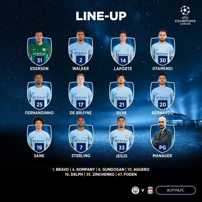 Manchester City Subs: Bravo, Aguero, Kompany, Foden, Gundogan, Zinchenko, Delph