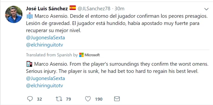 José Luis Sánchez, the famous journalist of Spanish TV 'La Sexta', has revealed in his Twitter that Asensio's injury is very hard...