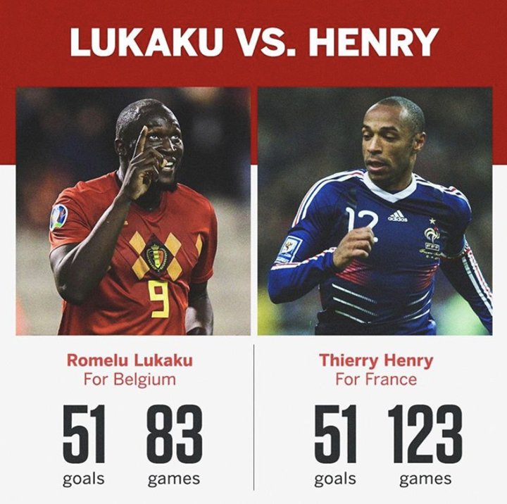 Romelu Lukaku has now scored as many international goals as Thierry Henry... in 40 fewer games!