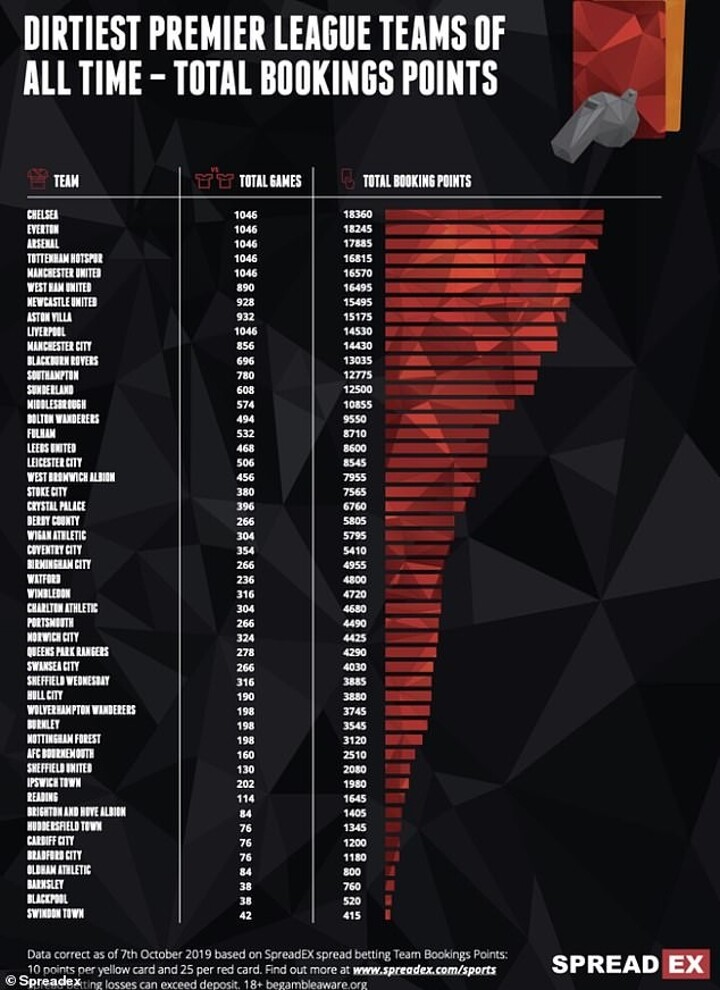 Teams have been awarded 10 points for a yellow card and 25 for a red card and adding up the sums saw Chelsea accrue a whopping 18,360 points, blowing away their rivals.
