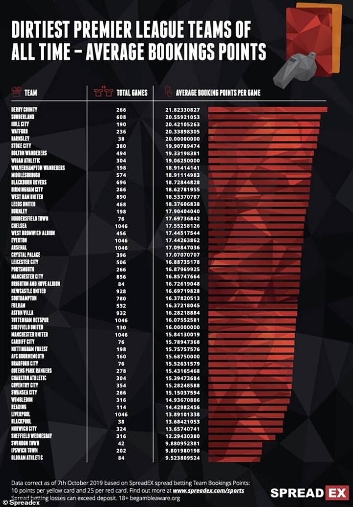 This study has knocked Chelsea off the top and instead Derby take the crown with an average of 21.82 booking points per game based on the 266 Premier League matches they have played. 8