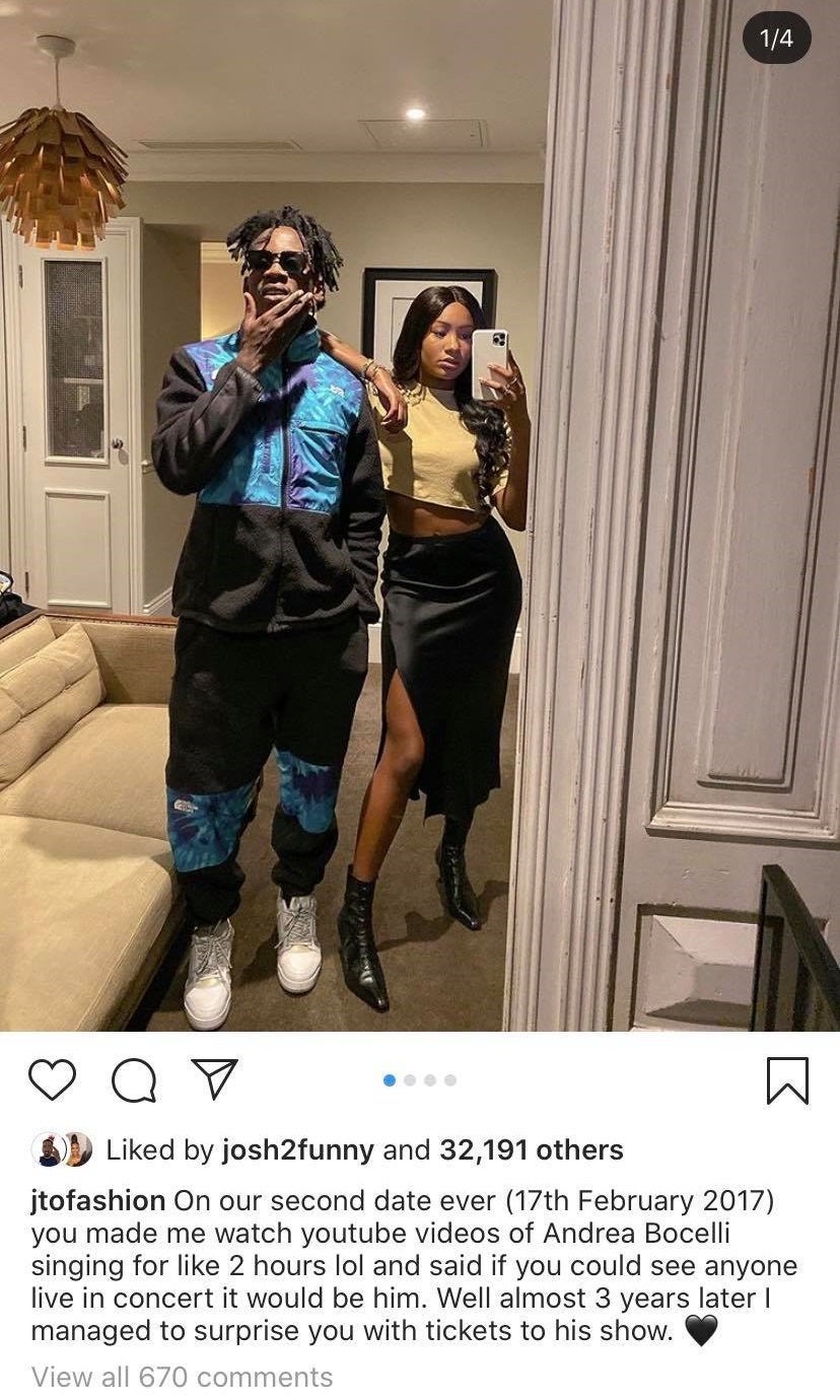The fashion blogger had taken to Instagram to reveal that she had gotten him a surprise gift while recounting how the singer made her watch performance of Italian Opera singer, Andrea Bocelliwatch, on YouTube