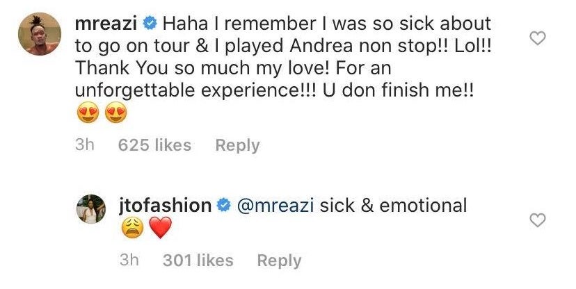 “Haha, I remember I was so sick about to go on tour & I played Andrea non-stop!! Lol!! Thank You so much, my love! For an unforgettable experience!!! U don finish me!! ”