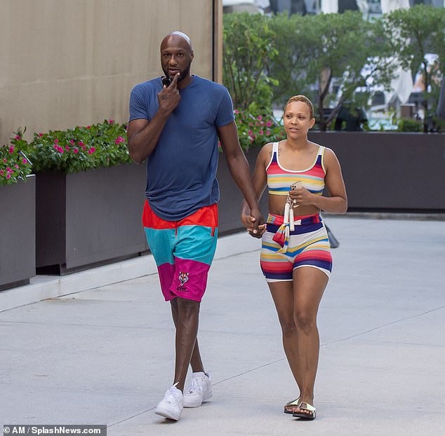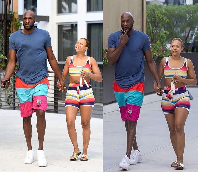For the outing, Lamar rocked a blue T-shirt and colorful pair of shorts while his bride-to-be wore a rainbow print two-piece along with flashy slides.