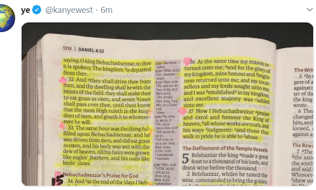 Rapper West is using his Twitter handle to preach and he posted a lot of Bible passages this Monday morning Read the screenshot below..............