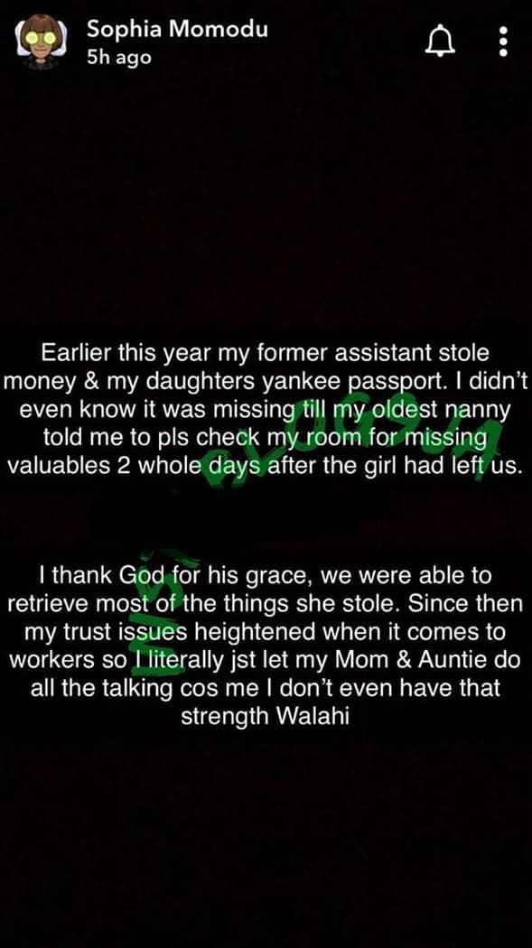 Davido’s first baby mama, Sophia Momodu has shared a story on her Instagram page, revealing how her former housemaid stole money and her daughter Imade’s US passport.