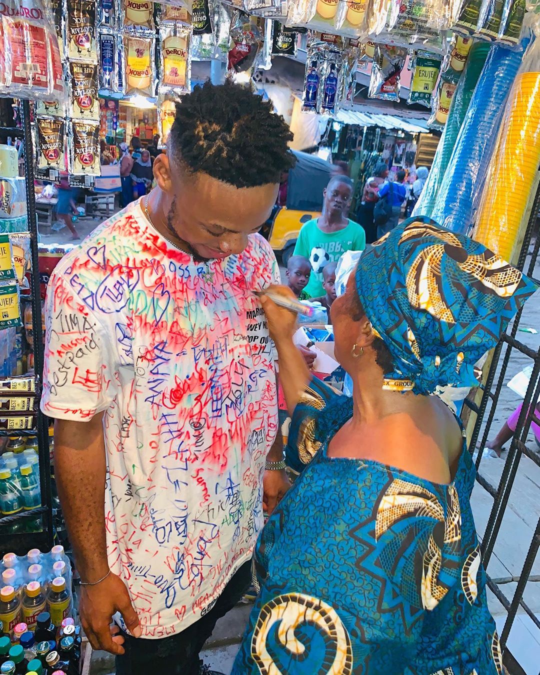Pocolee who tagged himself as a ‘Marlian wey no dey drop out’ shared photos on his Instagram page which shows his mom signing on his T-shirt.