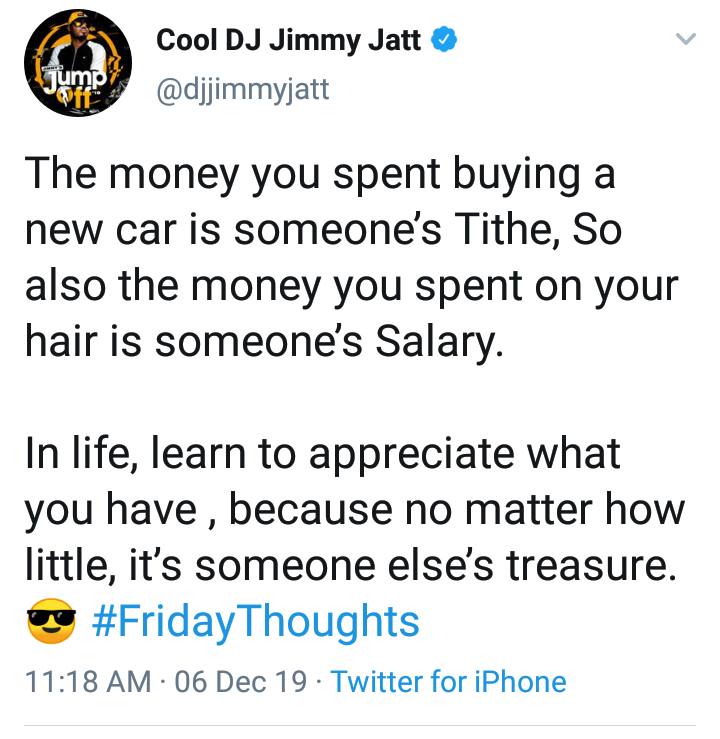 In life, learn to appreciate what you have , because no matter how little, it’s someone else’s treasure. 😎 #FridayThoughts” ‘ he wrote.