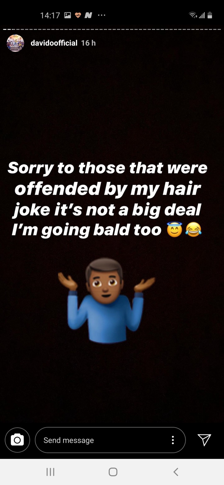 Nigerian music superstar, Davido has apologised to Mr P, E-Money and Kcee over a joke he made about their hair a few days ago. In a video he shared on his Instagram page, he teased them about their hair loss showing off his hair and beard. He ended by saying 'No Wig Sh*t'.