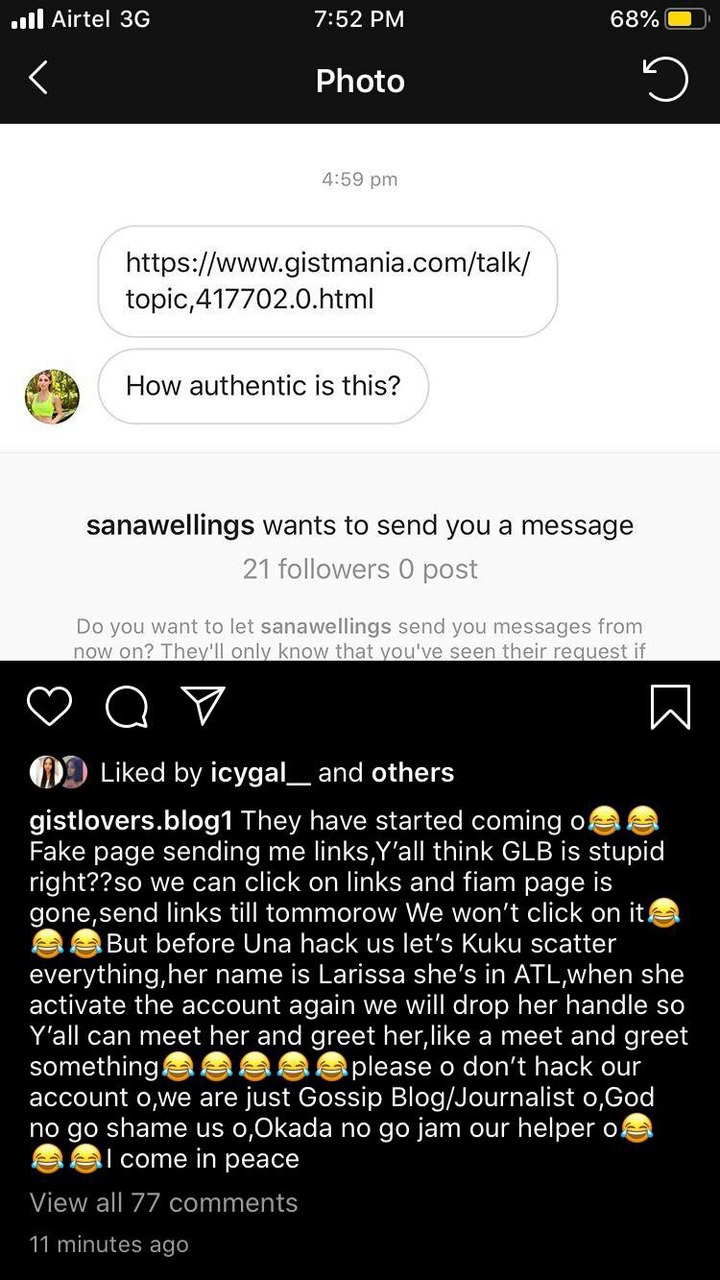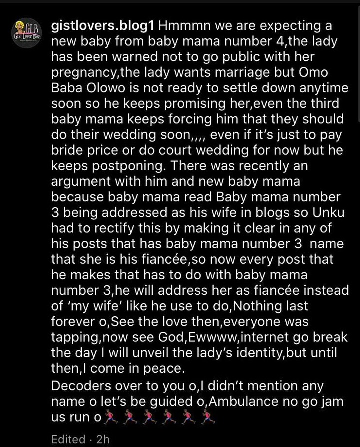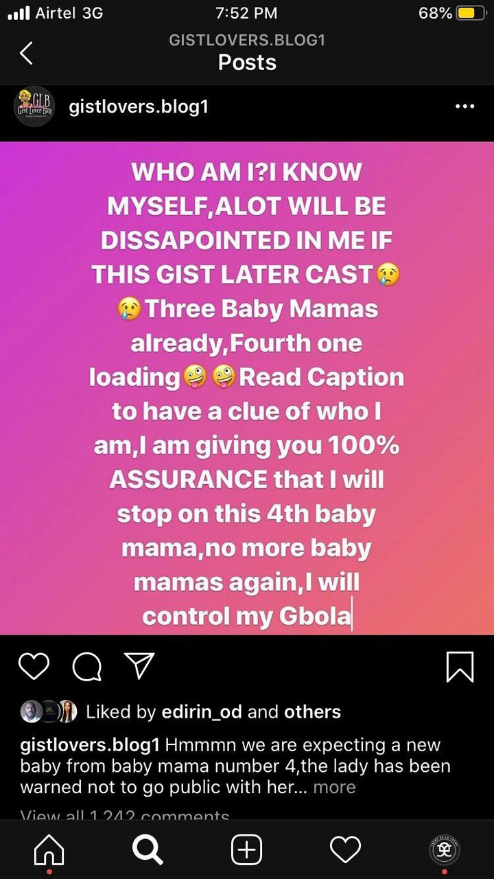 A popular instagram page, Gist lover blog, notorious for having confirmed insider details is alleging that he is expecting a 4th child with a lady in the US called Larrisa, see their report below;