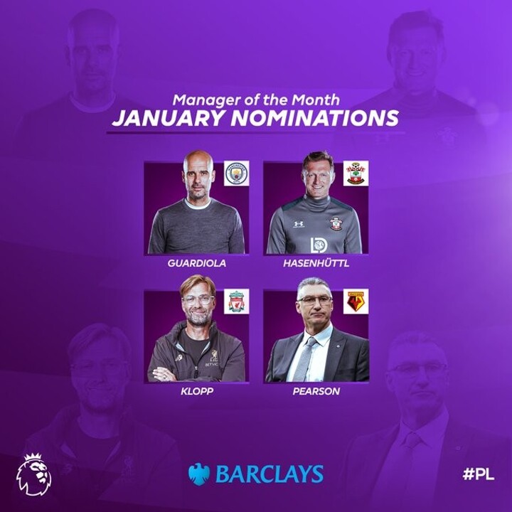 Pep Guardiola, Ralph Hasenhuttl, Jurgen Klopp and Nigel Pearson are nominated for Premier League Manager of the Month for January.