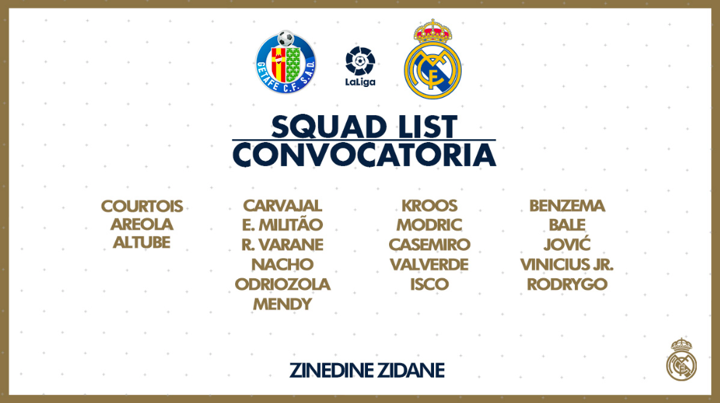 Zinedine Zidane has submitted his 19-man squad list for Real Madrid's match away at Getafe on Saturday afternoon, yet Lucas Vazquez, Marcelo and James Rodriguez have failed to be included.