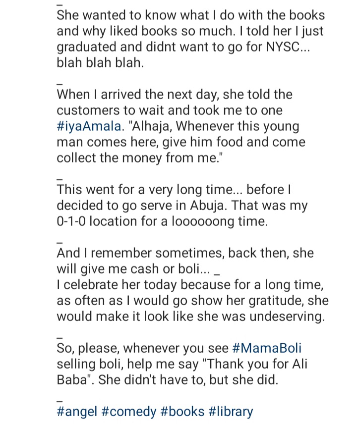 When I arrived the next day, she told the customers to wait and took me to one #iyaAmala. "Alhaja, Whenever this young man comes here, give him food and come collect the money from me."