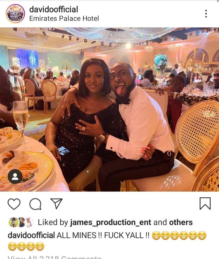 Davido who posted a picture of him grabbing Chioma’s breast on Instagram captioned it ” All mine,F**KYALL.