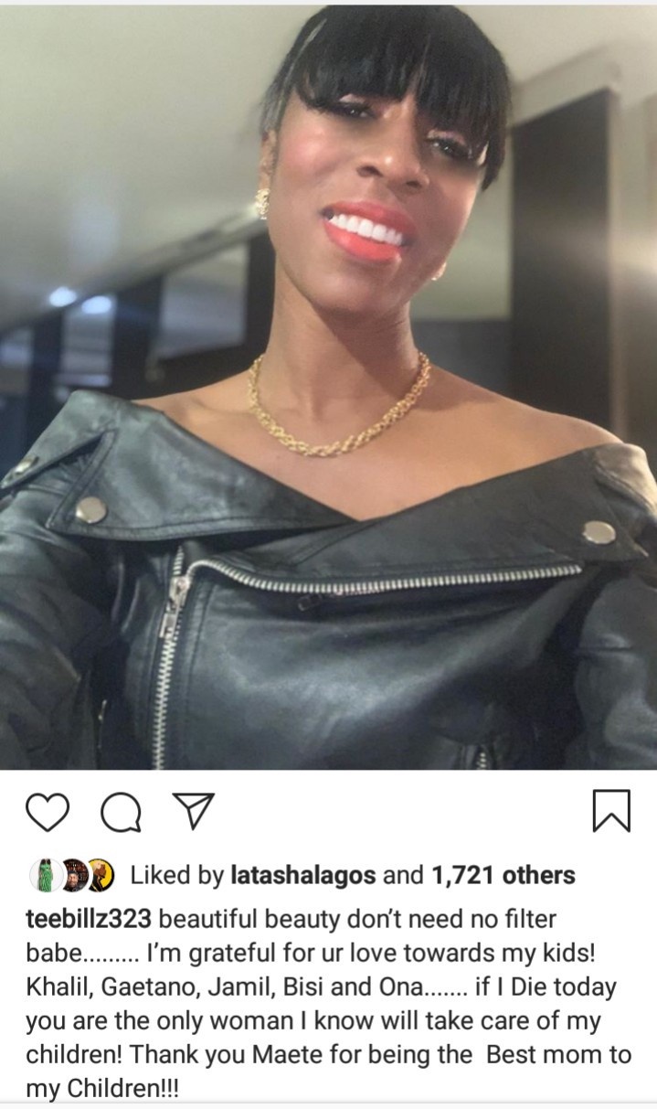 He wrote: "beautiful beauty don’t need no filter babe......... I’m grateful for ur love towards my kids! Khalil, Gaetano, Jamil, Bisi and Ona....... if I Die today you are the only woman I know will take care of my children! Thank you Maete for being the Best mom to my Children!!!"