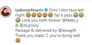 "Omo I don taya last night 😁😁😄😃😀 faji ti poju.🤪🤪🤪 Love you both forever @fedel_x & @its.priscy Package & delivered by @lewagift Thank you loads 🥰 you're doing well 😁"