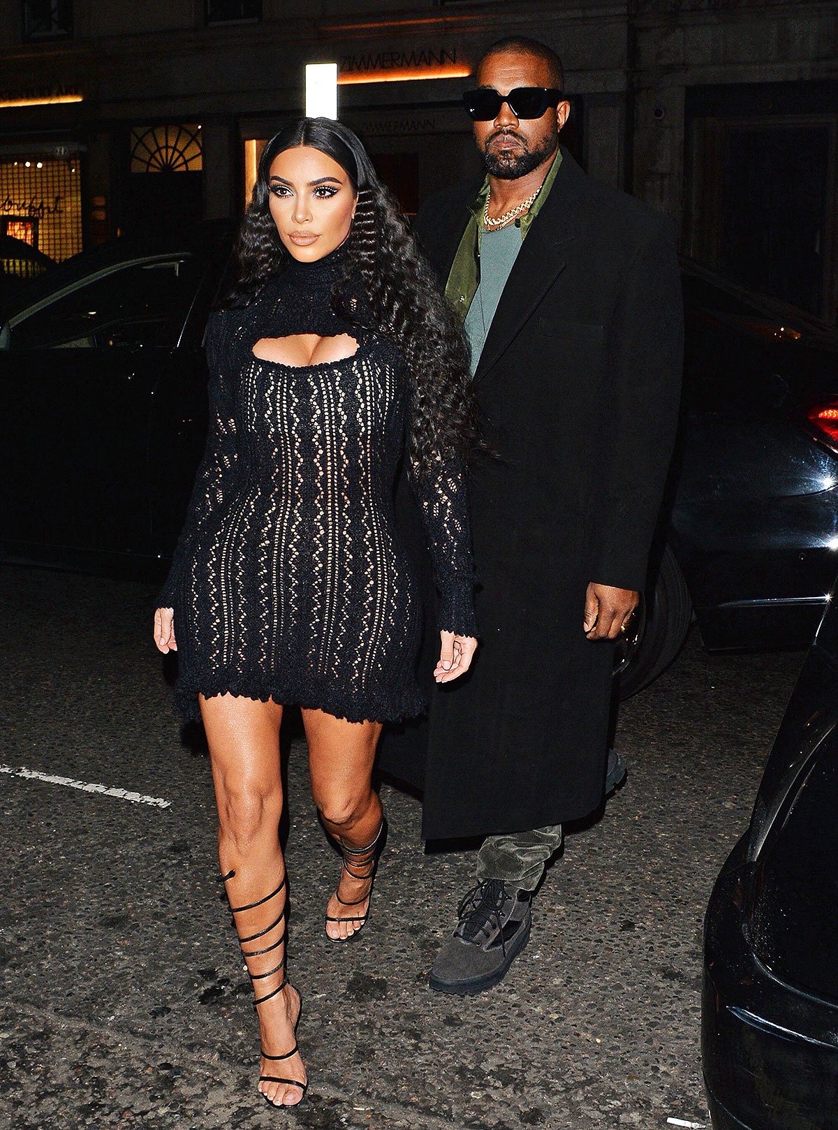 The parents of four dined at the Chinese restaurant Hakkasan, and were photographed wearing coordinated looks as they entered. Kardashian West, 39, wore a vintage long-sleeve black knitted mini dress with a revealing cutout by Vivienne Westwood and rhinestone-embellished gladiator-style stilettos that coiled up to her knees from Rene Caovilla.