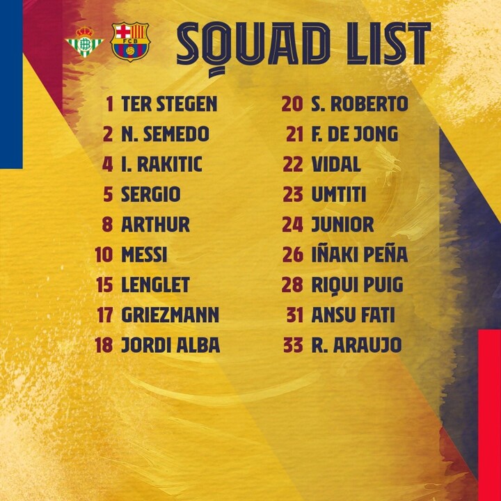MF: Rakitic, Busquets, Arthur, Roberto, De Jong, Riqui Puig, Vidal