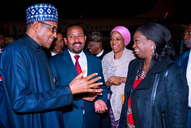 : President Buhari received by Prime Minister of Ethiopia H.E. Abiy Ahmed and Nigerian Ambassador to Ethiopia Amb. Bankole Adeoye as he arrives Addis-Ababa Ethiopia ahead of 33rd Ordinary Session of the Heads of State and Government of the African Union (AU) on 7th Feb 2020