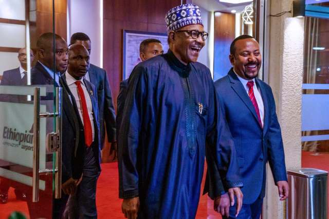 President Buhari with Prime Minister of Ethiopia H.E. Abiy Ahmed, Governor Hope Uzodinma of Imo State, Governor Ben Ayade of Cross River State and other dignitaries as he arrives Addis-Ababa Ethiopia ahead of 33rd Ordinary Session of the Heads of State and Government of the African Union (AU)