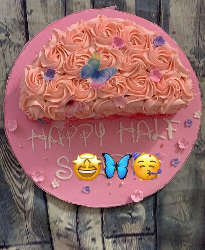 The former reality star had a mini celebration, that included a cake with the words "Happy half" written on it.