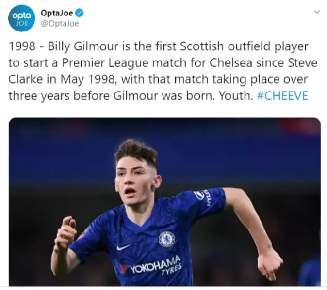 Billy Gilmour has breaks 21 year old record being the first Scottish outfield player to start a Premier League for Chelsea since Steve Clarke in may 1998,which was three years before Billy Gilmour was born.