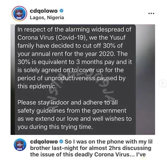 The rapper said he did it in respect to the outbreak of COVID-19, adding that himself and his family has decided to cut off 30% of the annual rent of 2020.