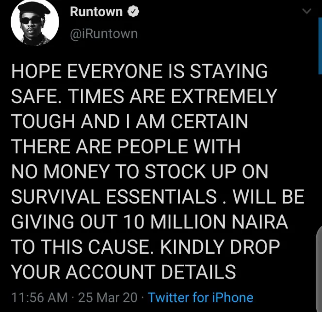 Amongst the celebrities who offered to help Nigerians out is Runtown, the Mad Over You crooner. Runtown announced earlier on his Twitter page to give N10 million and many of his fans have begun to show evidence of receipt.