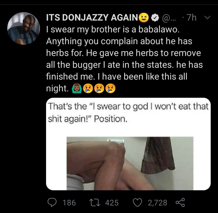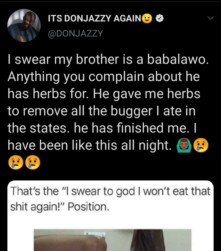 "I swear my brother is a babalawo. Anything you complain about he has herbs for. He gave me herbs to remove all the bugger I ate in the states. he has finished me. I have been like this all night. 🙆🏾♂️😢😢😢".