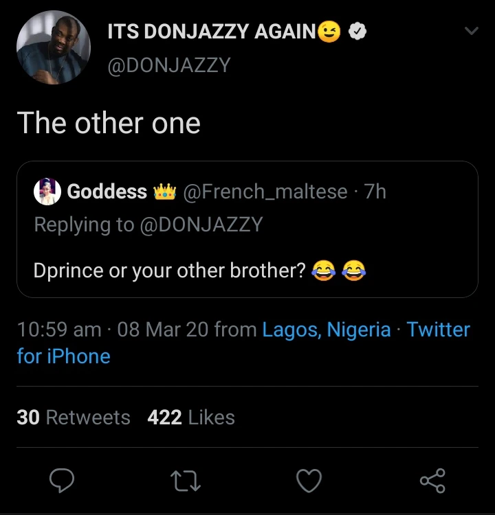 A twitter user asked if the brother he was referring to is his popular musician sibling, Dprince, but Don jazzy replied with a no and said it was his other brother.