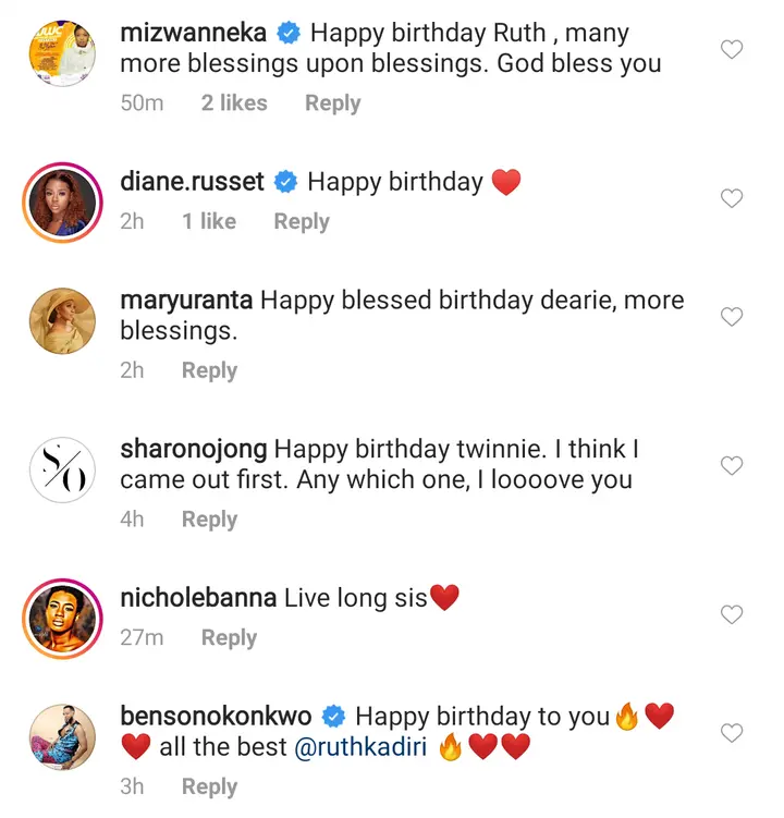 Another comment sighted was from actress Benson Okonkwo, who sent her best wishes to her colleague. Ruth's birthday mate, Sharon Ojong was also not left out as she wrote, "Happy birthday twinnie. I think l came out first. Any which one, l loooove you".