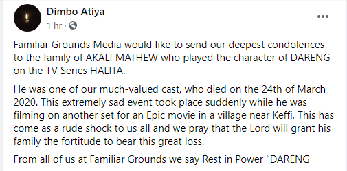 “Familiar Grounds Media would like to send our deepest condolences to the family of AKALI MATHEW who played the character of DARENG on the TV Series HALITA.He was one of our much-valued cast, who died on the 24th of March 2020. This extremely sad event took place suddenly while he was filming on another set for an Epic movie in a village near Keffi. This has come as a rude shock to us all and we pray that the Lord will grant his family the fortitude to bear this great loss.From all of us at Familiar Grounds we say Rest in Power “DARENG “