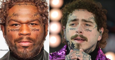 On Instagram 50 Cent posted a picture of his face that had been edited to give him curly brown hair and the Hollywood Is Bleeding rapper’s face tats, including barbed wire across his forehead and the words ‘Stay Away’ and ‘Always Tired’ around his eyes.