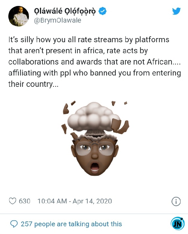 “It’s silly how you all rate streams by platforms that aren’t present in Africa, rate acts by collaborations and awards that are not African…. affiliating with people who banned you from entering their country…”