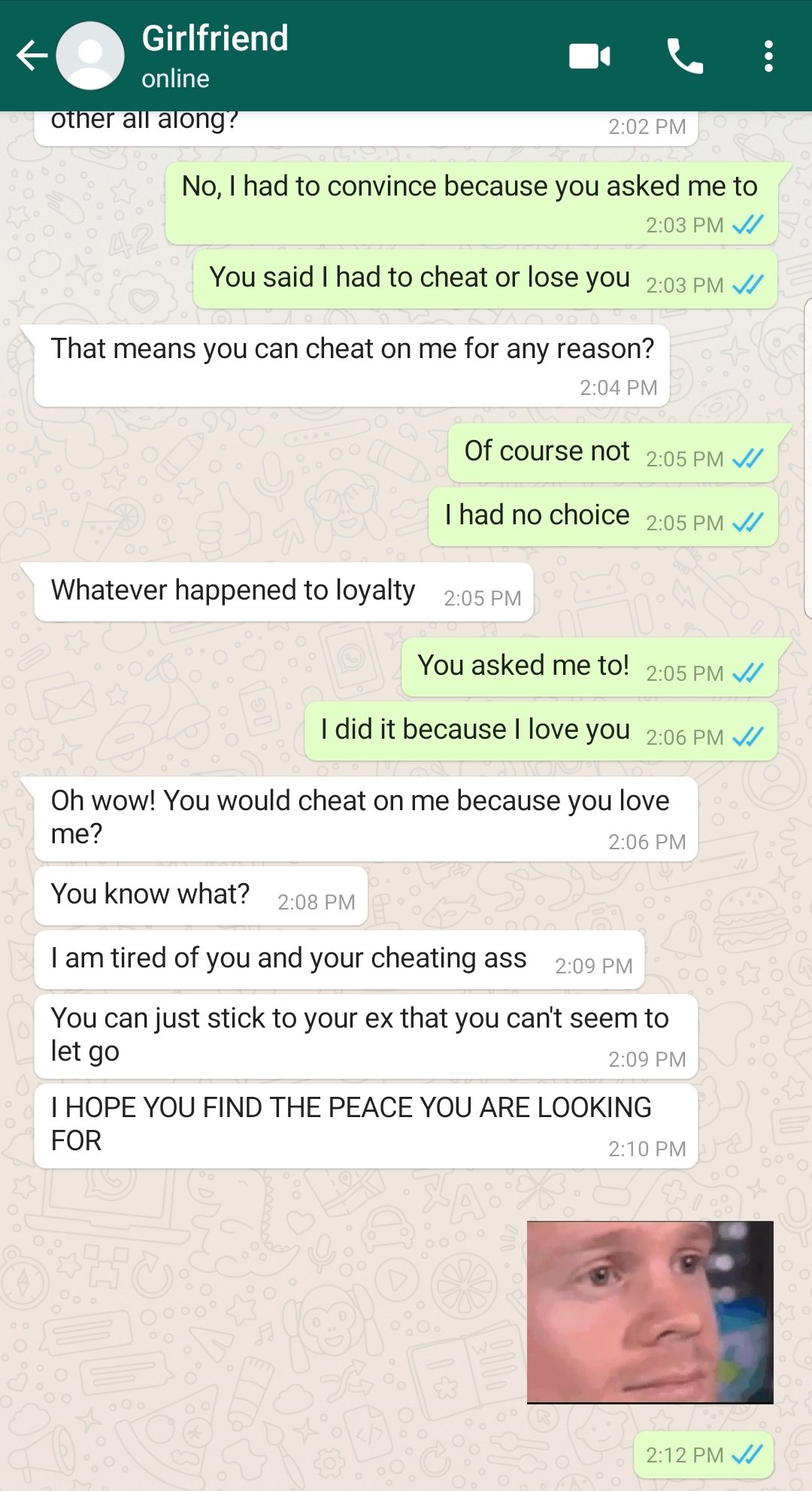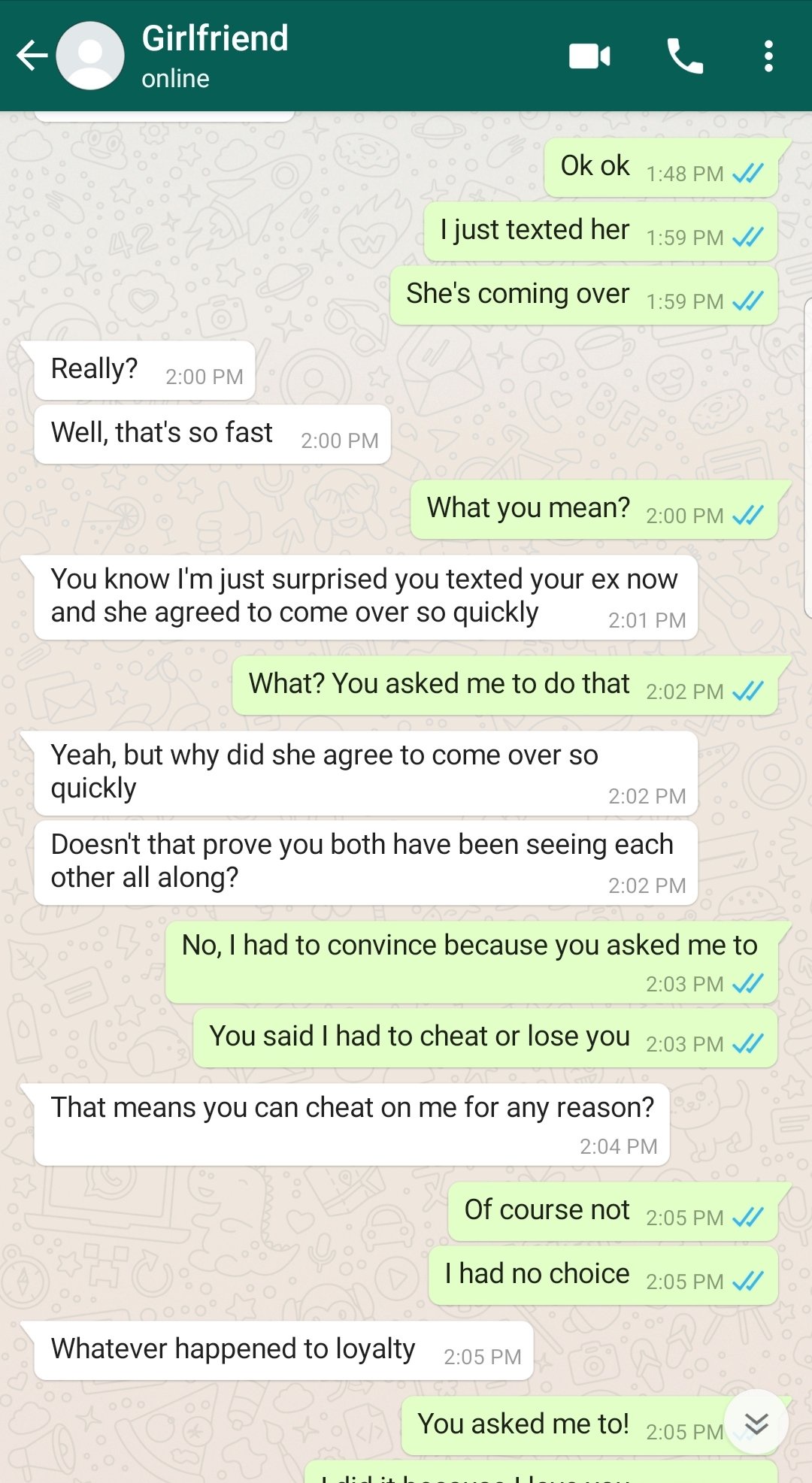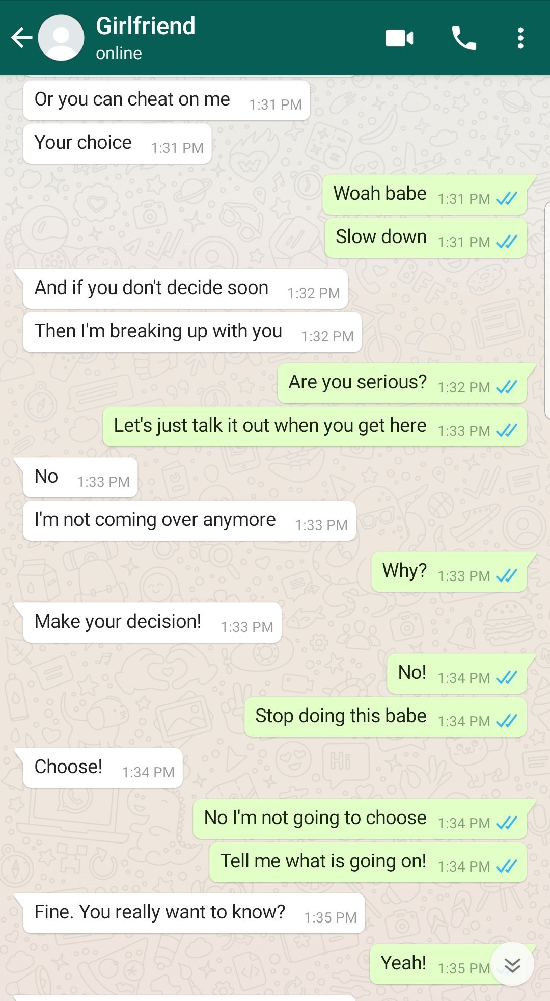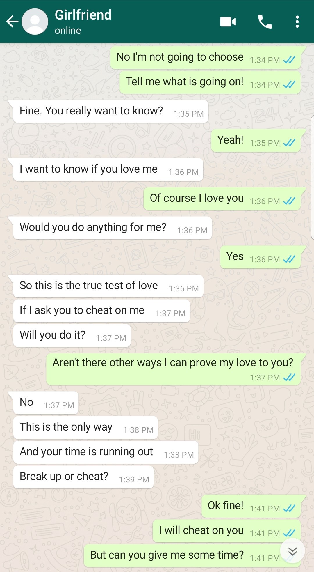 A Twitter User, Funny Banter shared a Screenshot of a Conversation between him and his girlfriend where she asked him to cheat on her or they Break Up.Read the conversation..Ladies of nowadays, they always come with different ideas....
