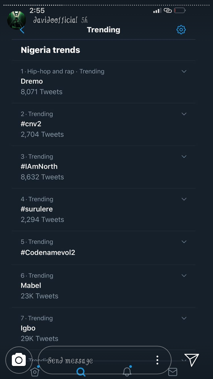 Davido shared snap that Dremo's album was number1 at the top of the most trending topic on twitter