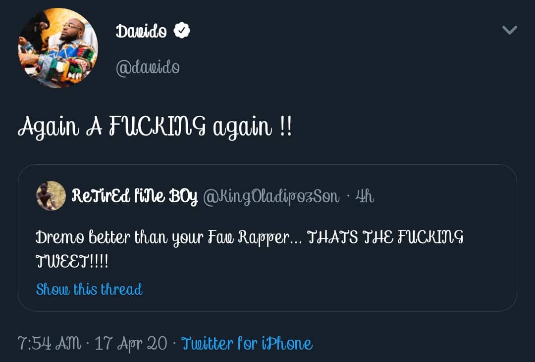 A fan with the handle @kingoladipozson tweeted "Dremo better than your fav rapper..THATS THE F*CKING TWEET!!!"