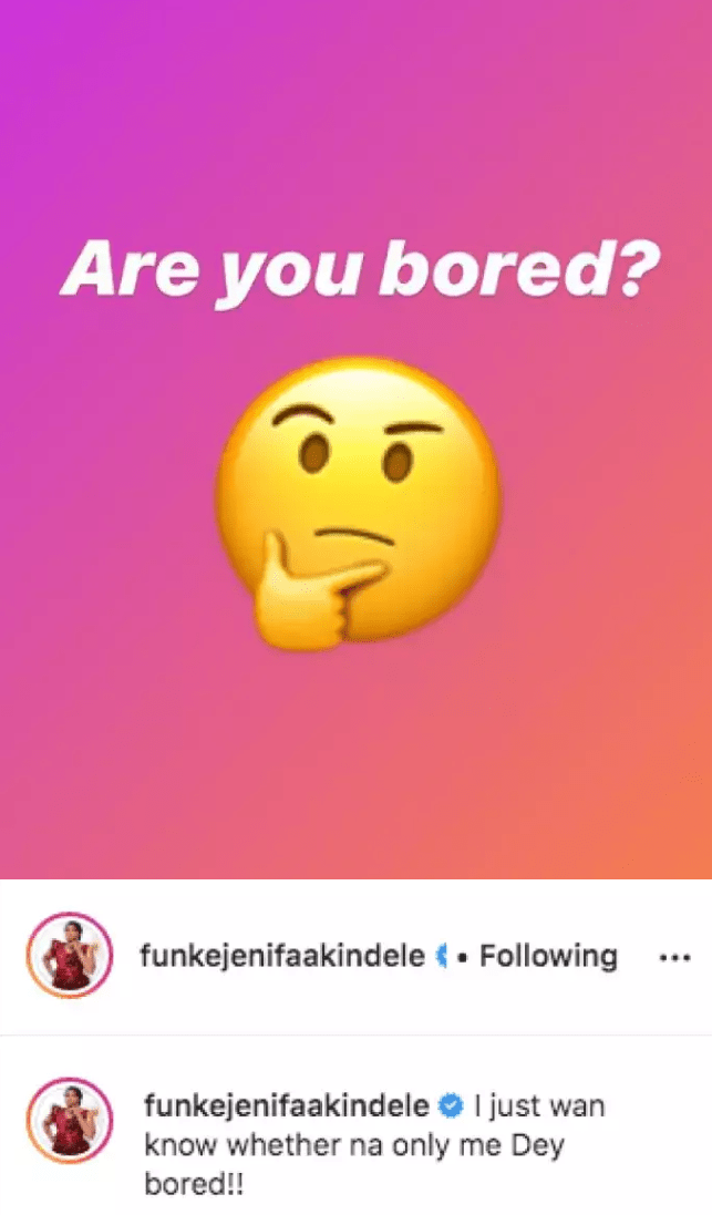 The songstress revealed this when actress Funke Akindele asked her IG fans if they are bored. Funke shared a picture text with inscription, “Are you bored“, explaining in her caption that she is asking to know if she is the only one tired of staying home.