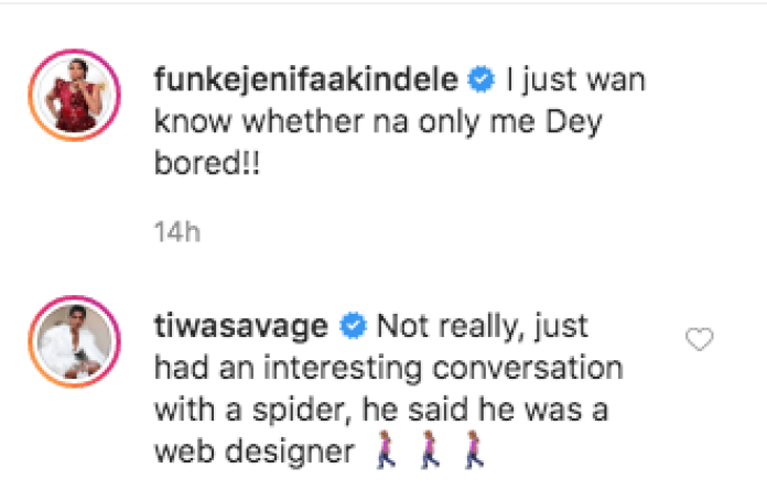 Showing up in the comment section, Tiwa Savage noted that she is not really bored as she just had an interesting discussion with a spider that told her of its web designing skills. “Not really, just had an interesting conversation with a spider, he said he was a web designer 🚶🏽♀️🚶🏽♀️🚶🏽♀️“, she commented.