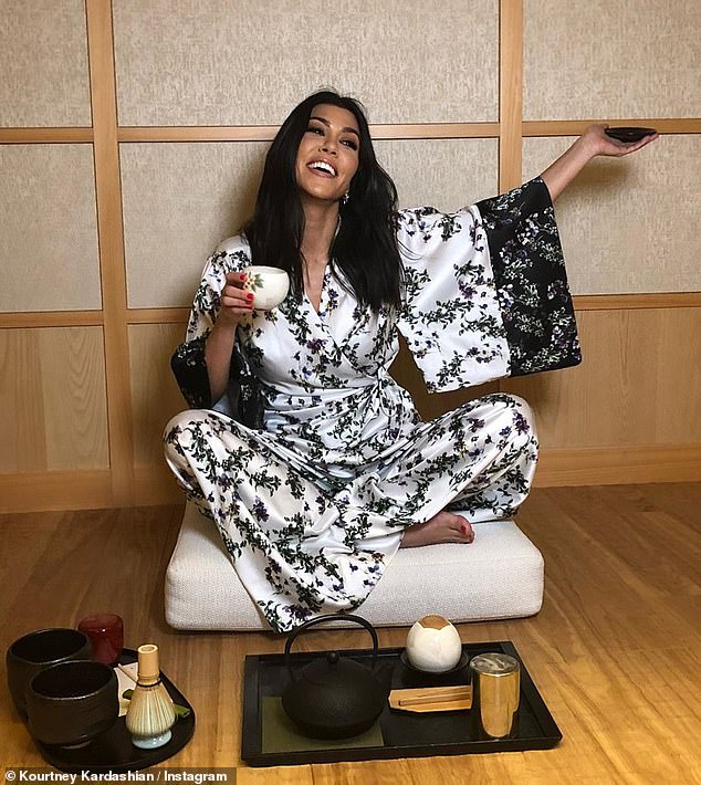 In her first snap, the wellness guru beamed, while sitting with her legs crossed on a beige cushion in a floral kimono robe.