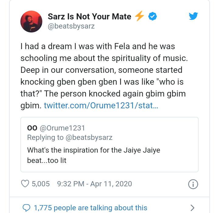 According to Sarz, he said he had a dream where he changed into With Fela who schooled him on the spirituality of tune.