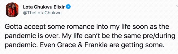 “Gotta accept some romance into my life soon as the pandemic is over. My life can’t be the same pre/during pandemic. Even Grace & Frankie are getting some“, she tweeted.