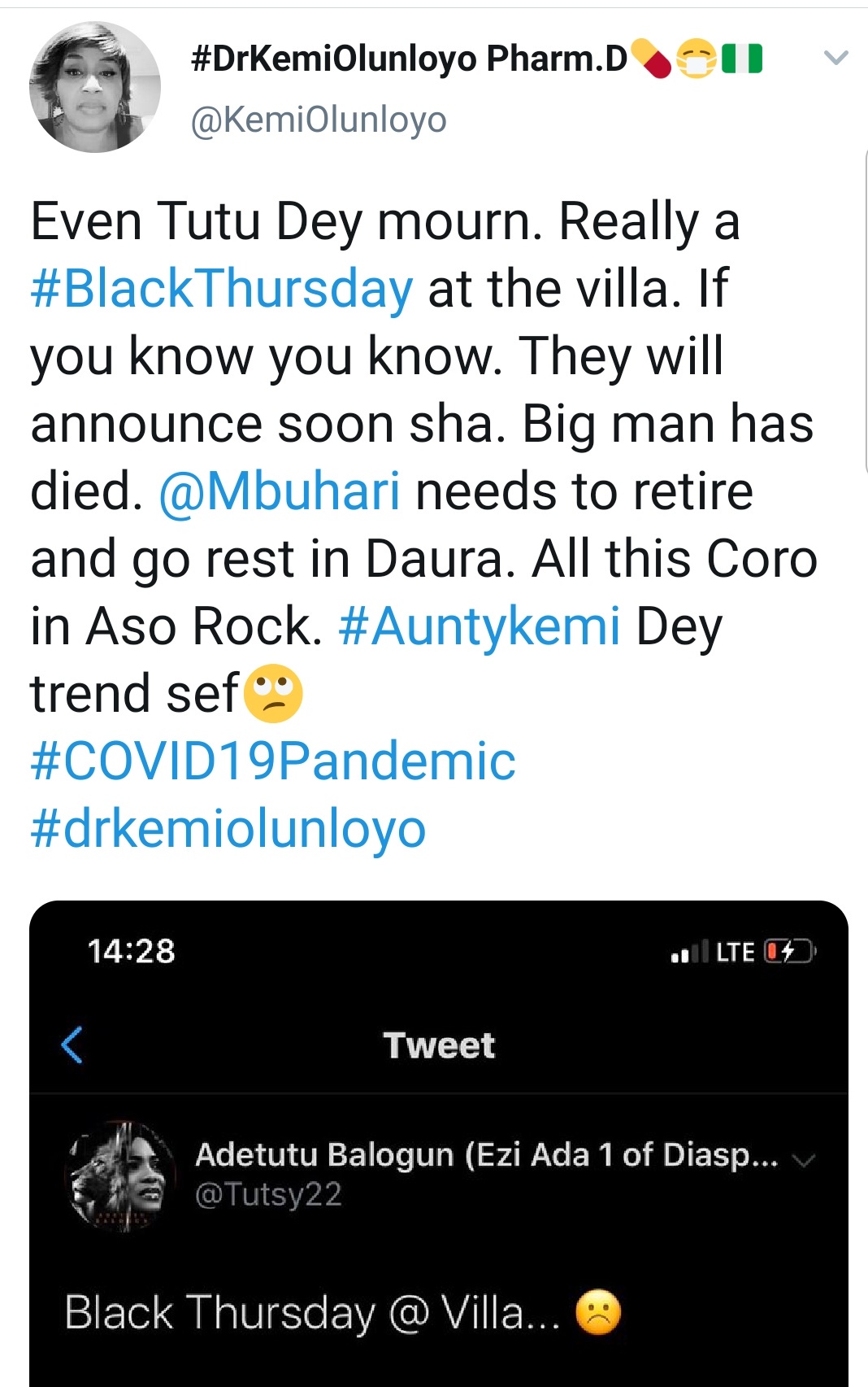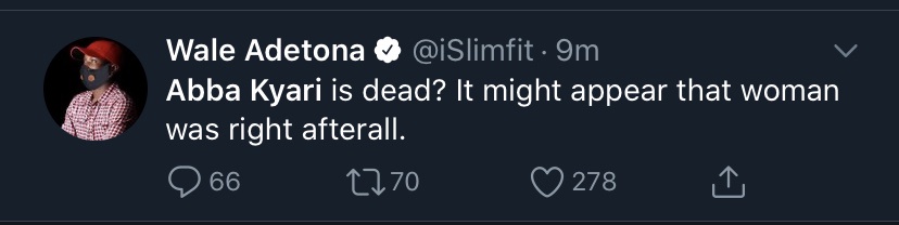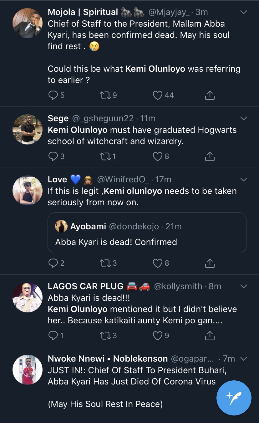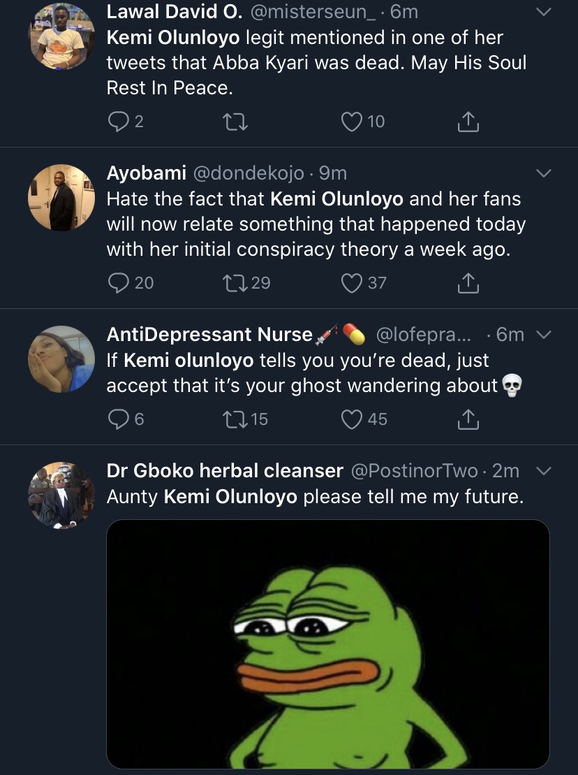 See Kemi Olunloyo's report about the supposed death weeks ago via her twitter account: