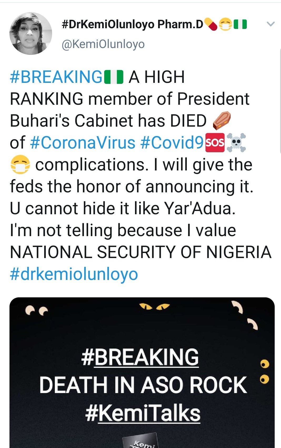 Investigative Journalist Kemi Olunloyo already reported the death before it was officially reported by the presidency today.